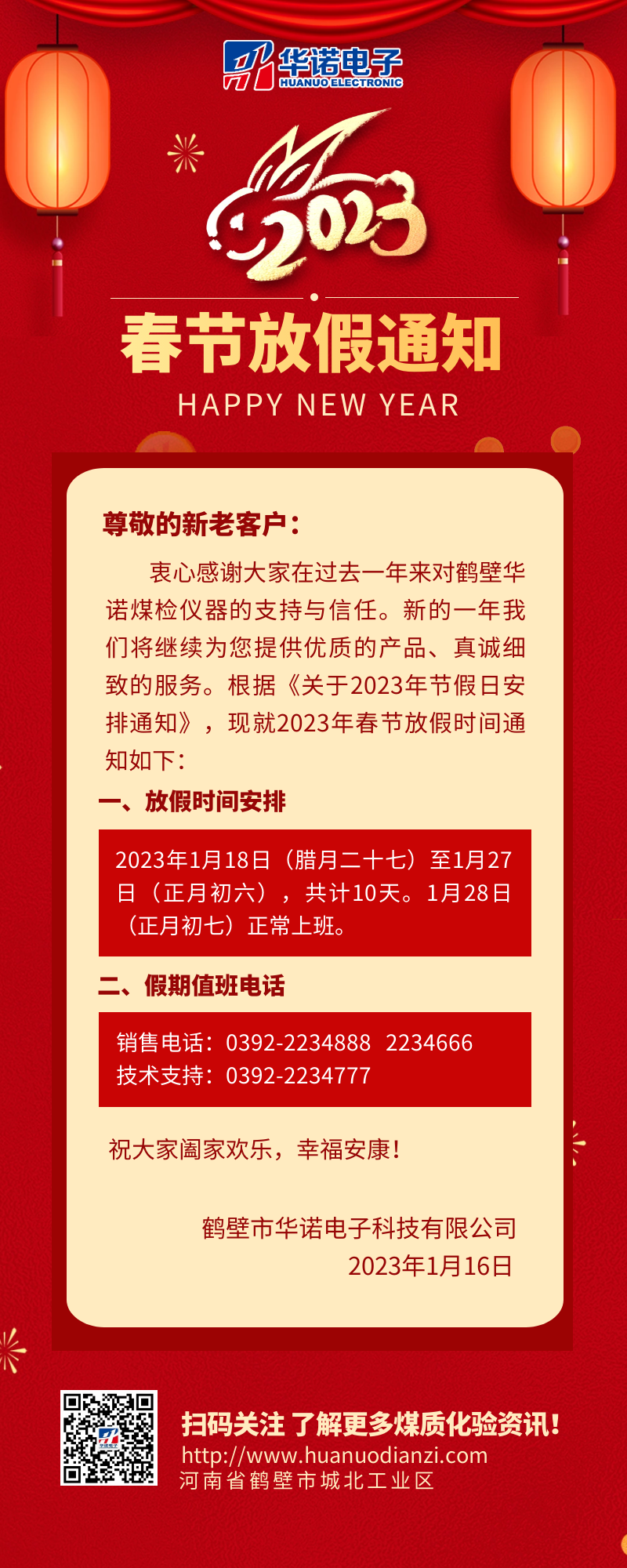【華諾電子 | 放假通知】華諾煤檢儀器 春節放假通知!